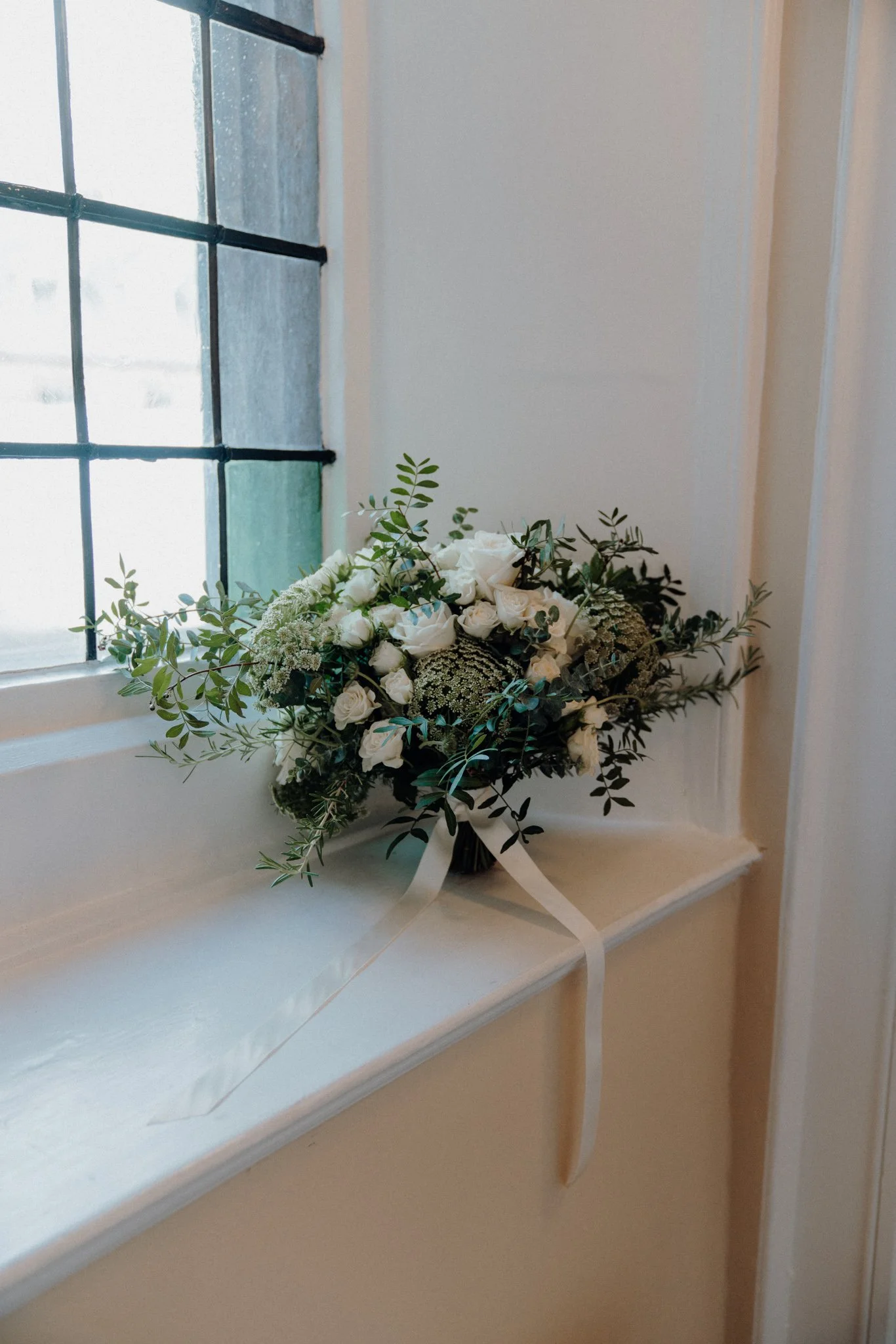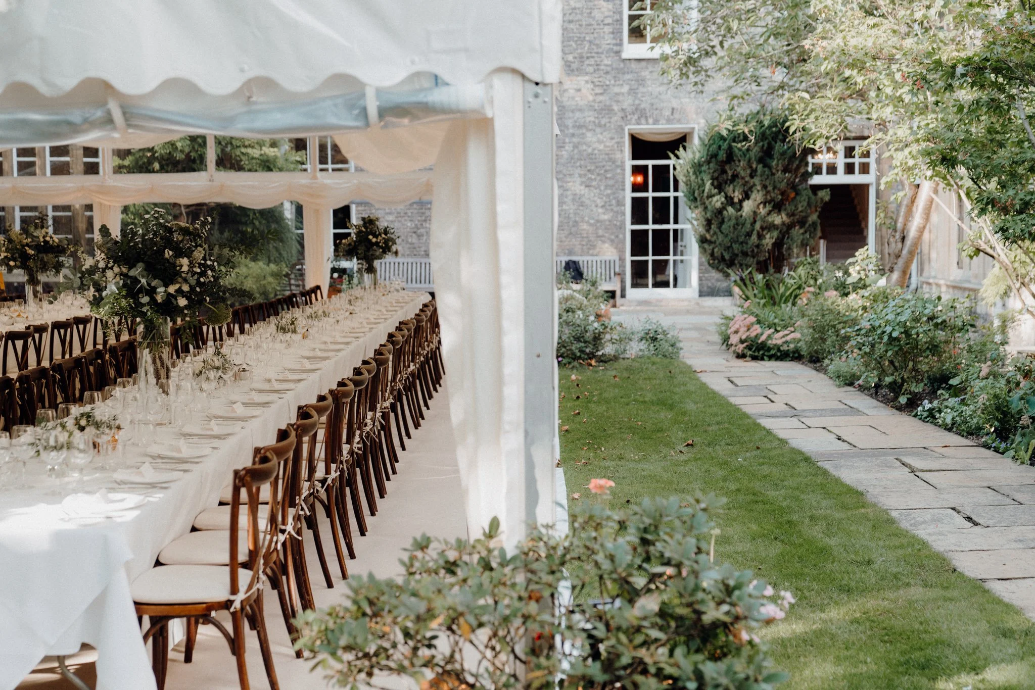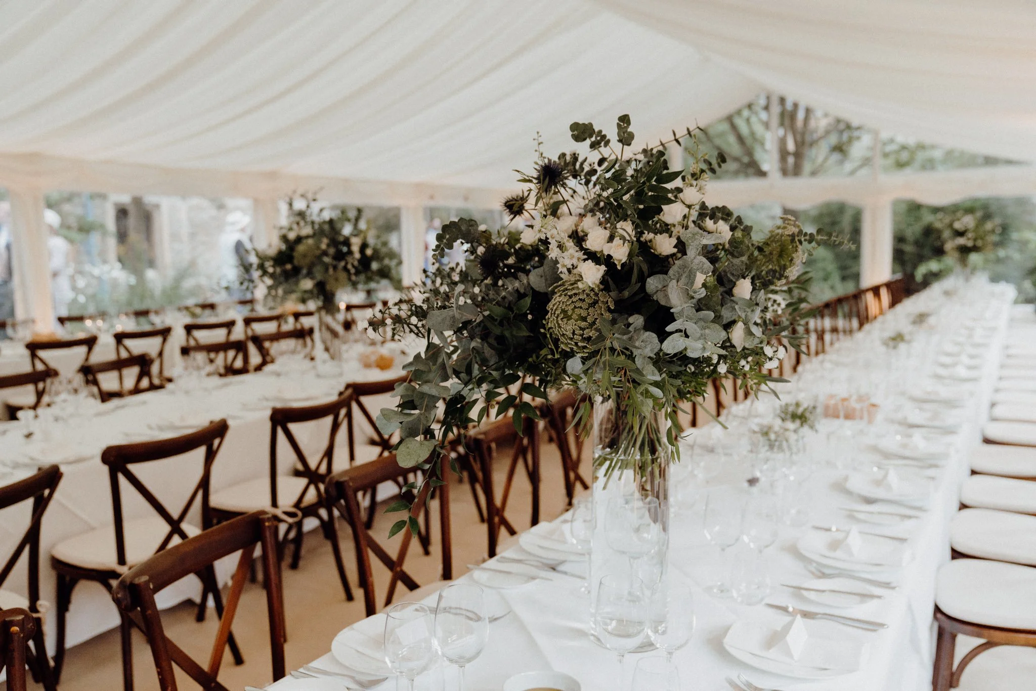 The marquee for this wedding was positioned in a spectacular walled garden within one of the Cambridge Colleges’. The tables were filled with large platters of food for the guests to feast upon which left little room for flowers. This conundrum was solved by placing tall glass vases of seasonal flowers and foliage in between the platters. With small bud vases and tall glass candlesticks amongst them the bride was able to achieve her dream of flowers, candles and food, all working together to create a stunning evening to remember.